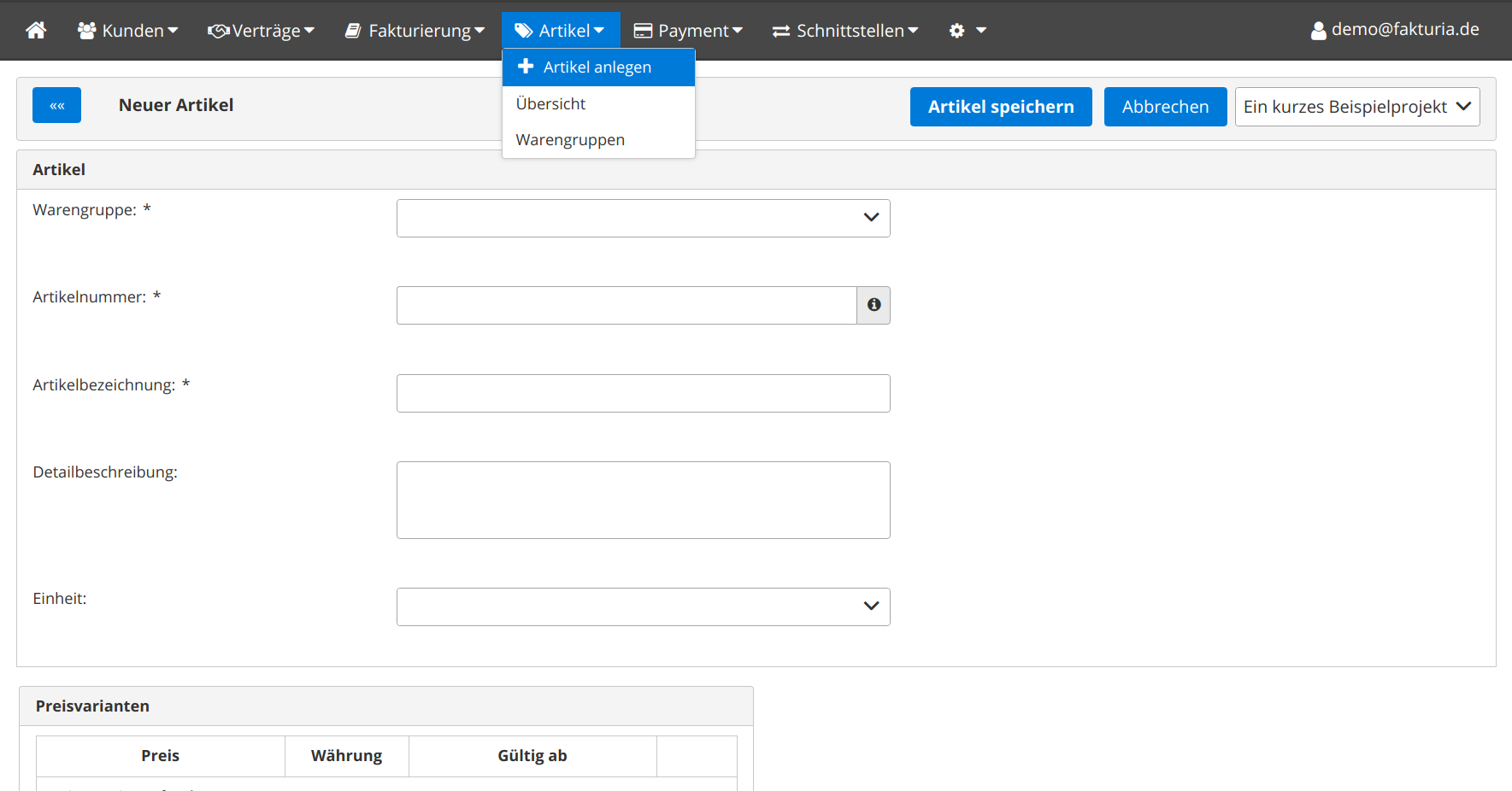 | Artikelbezeichnung | Name des Artikels, erscheint auf der Rechnung |