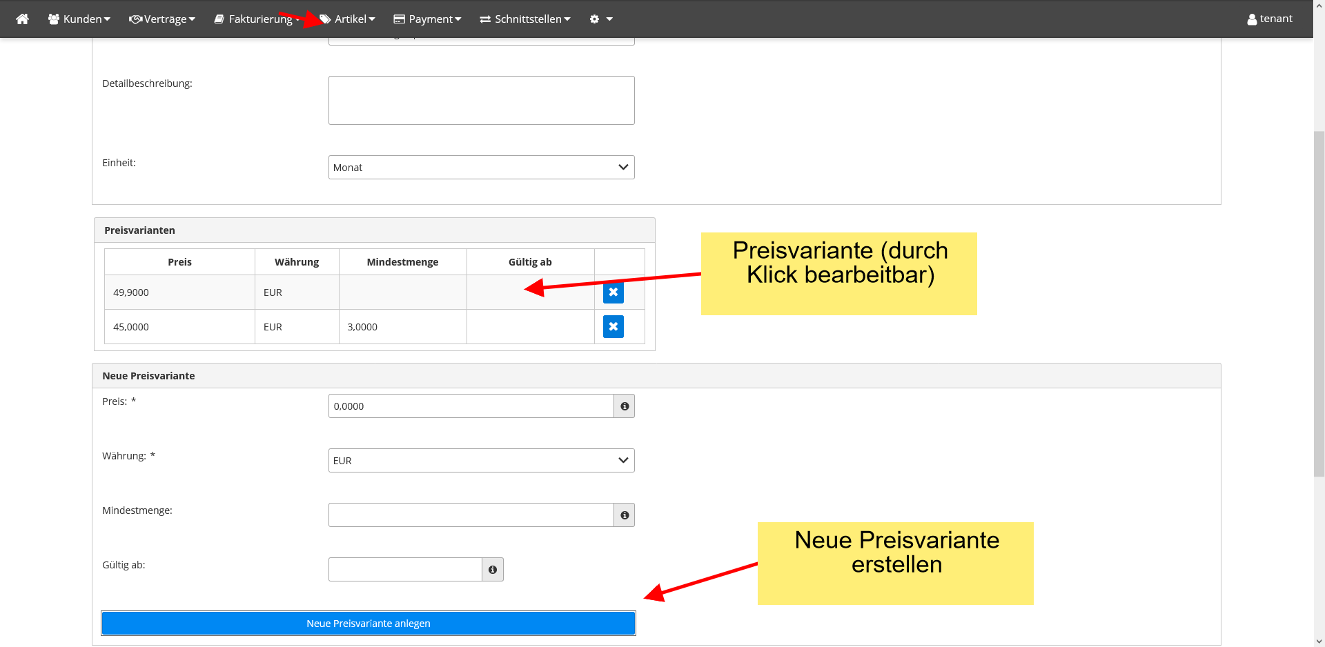 | Einheit | Die Einheit des Artikels. Für Abo-Artikel wählen Sie eine Zeiteinheit, z. B. MONAT |