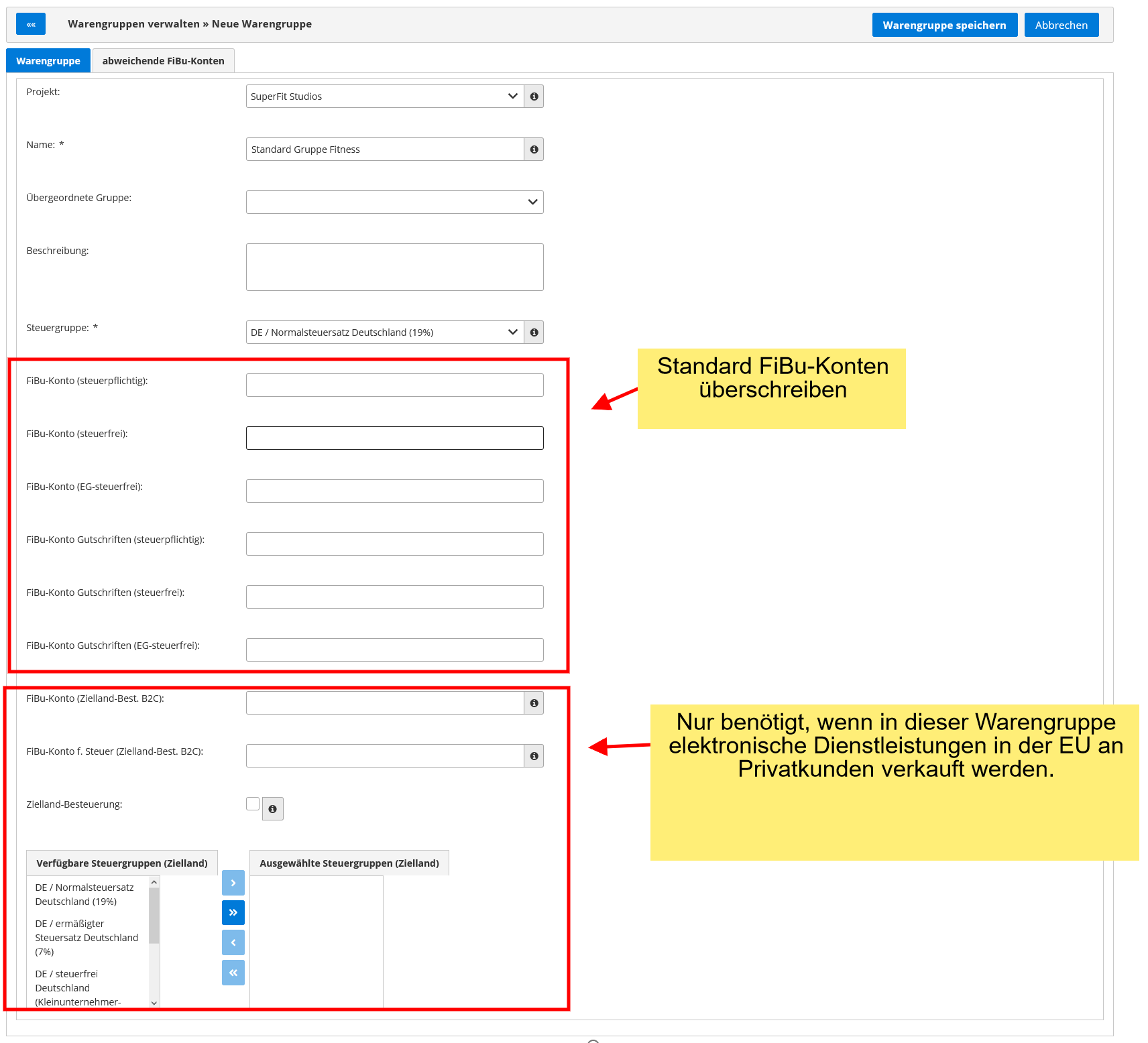 | Zielland-Besteuerung | Wenn Sie diese Checkbox aktivieren zeigen Sie an, dass sich in dieser Warengruppe Artikel für elektronische Dienstleistungen in der EU befinden. Für solche Artikel muss beim Verkauf an Privatkunden die Mehrwertsteuer des Ziellandes angewendet werden. Ist die Checkbox aktiviert, werden die darunterliegenden Steuergruppen (Zielland) für Privatkunden ausgewertet. |
