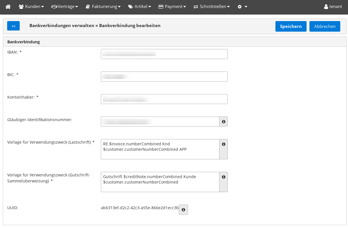Bankverbindung anlegen/bearbeiten: