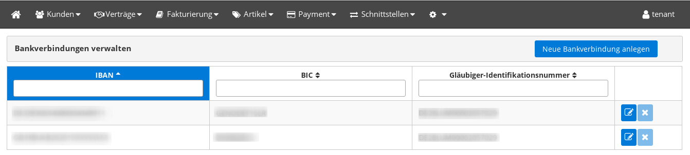 Hier können Sie SEPA-Bankverbindungen anlegen, die u.A. für die Generierung von SEPA-XMLs (Sammel-Lastschriften/Auszahlungen) verwendet werden.