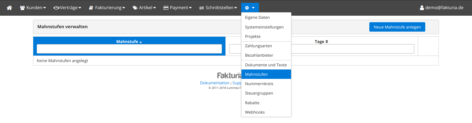 Sie können beliebig viele Mahnstufen anlegen. Hauptkriterium sind dabei immer die vergangenen Tage seit der letzten Mahnung. Bei der ersten Mahnstufe sind es die Tage seit Fälligkeit der Rechnung.