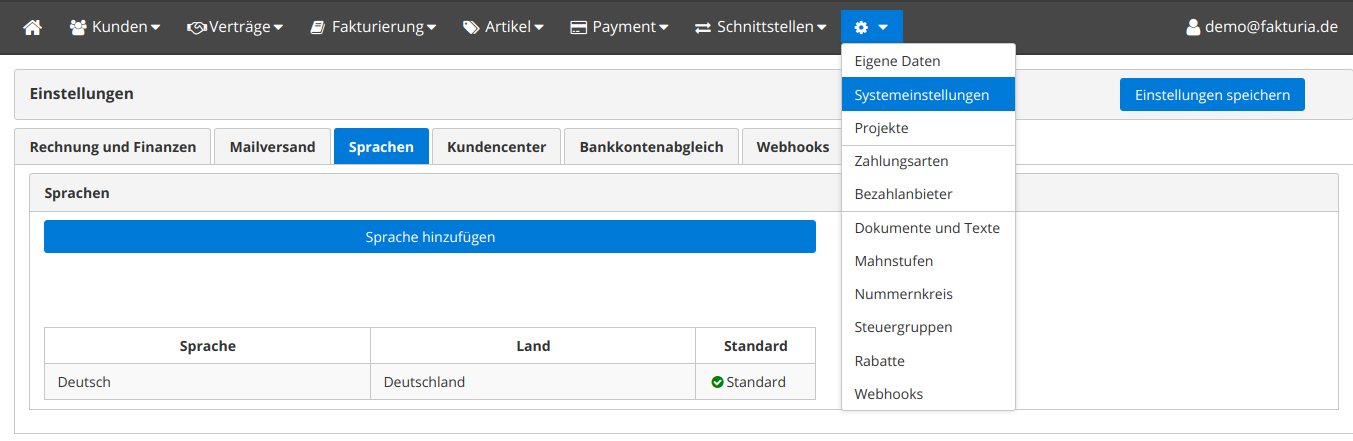 Eine Sprache ist in Fakturia immer die Kombination aus der Sprache selbst und dem Land. Dies ermöglicht eine sehr flexible Konfiguration.