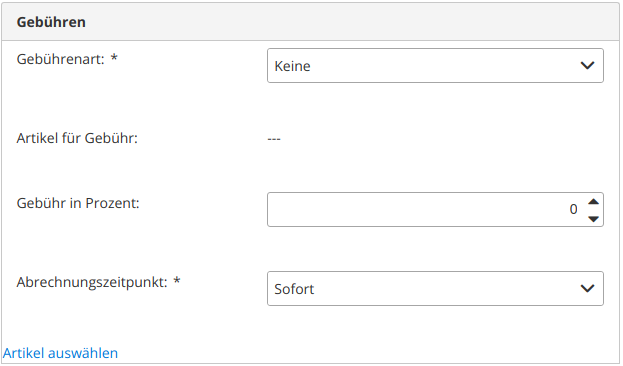 | Gebühren Chargeback / Rücklastschrift | Hier können Sie einen Artikel auswählen, der bei einer Rücklastschrift als Gebühr in Rechnung gestellt werden soll. |
