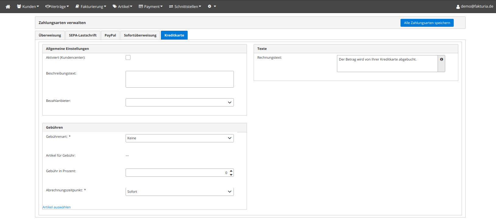 | Rechnungstext | Freitext, der auf der Rechnung (PDF) für diese Zahlungsart angezeigt werden soll. |