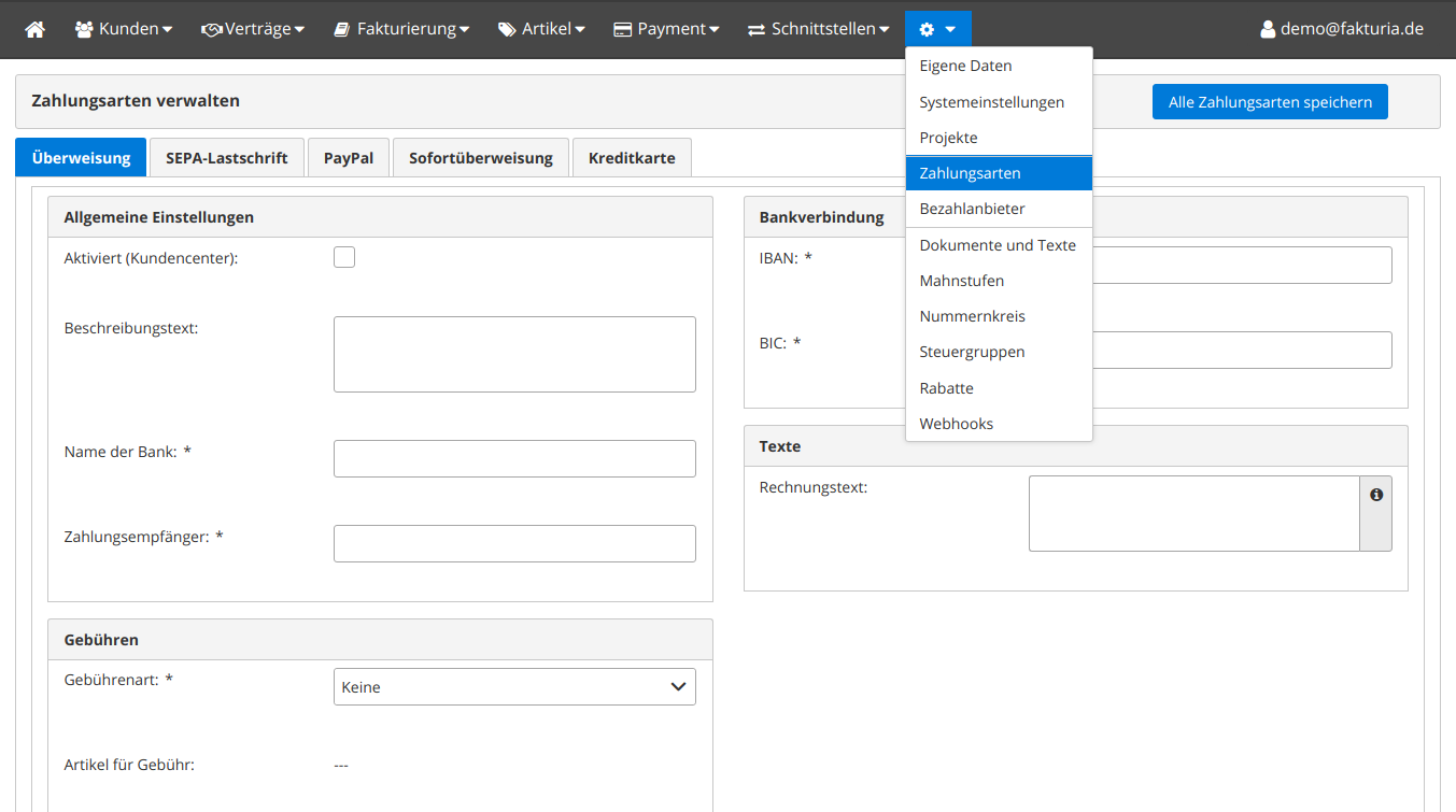 Hier nehmen Sie die Einstellungen für die Zahlungart "Überweisung" vor.