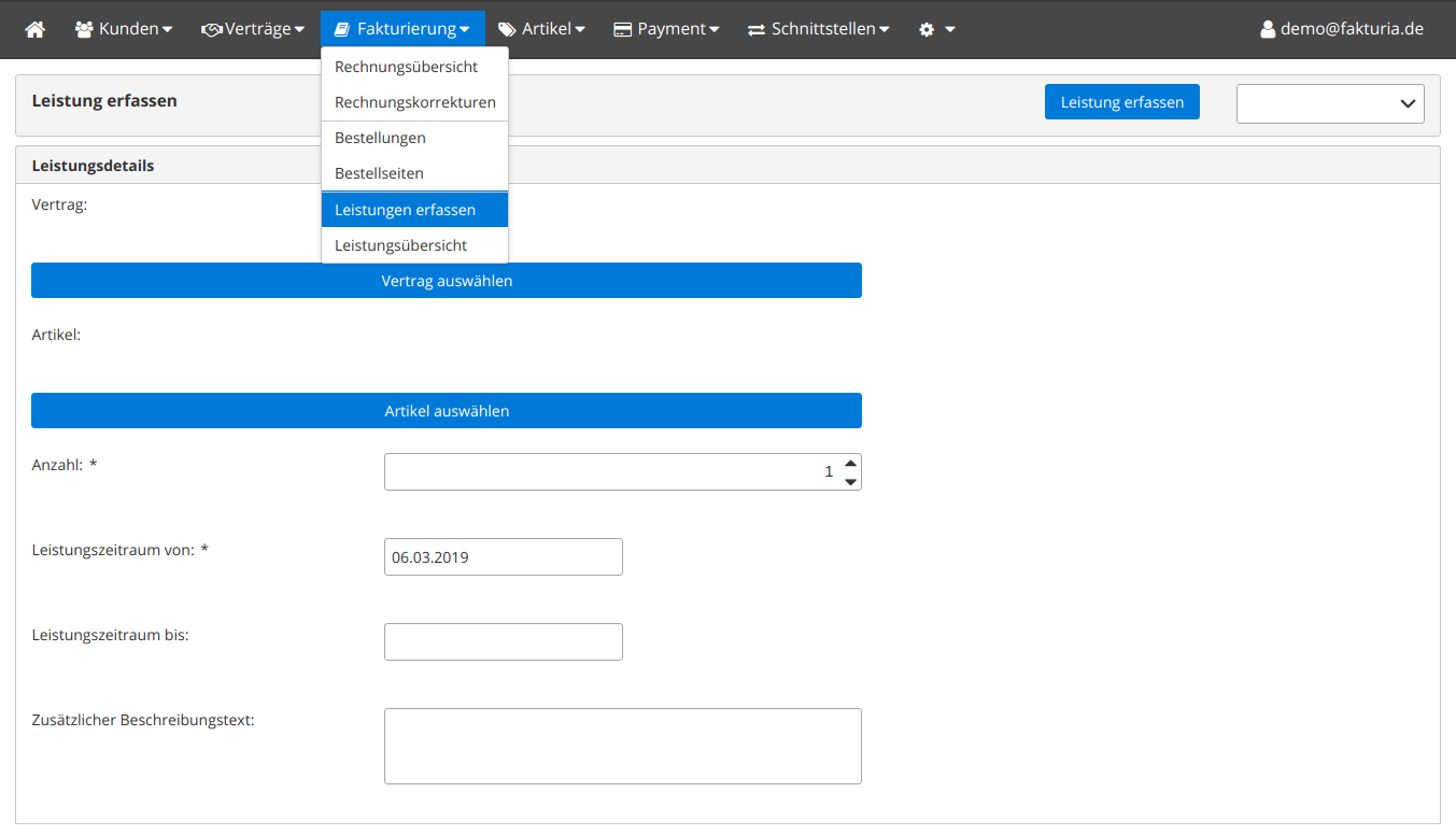 Wenn Sie eine Leistung gebenüber Ihrem Kunden erbracht haben, können Sie diese dem System mitteilen. Die Leistungserfassung ist völlig unabhängig von der Rechnungserstellung. Sie teilen Fakturia lediglich mit, welche Leistung (welcher Artikel) zu welchem Zeitpunkt für welchen Vertrag erbracht wurde. Das System entscheidet selbständig anhand der Vertragsdaten, wann diese Leistung auf einer Rechnung an den Kunden erscheinen wird.