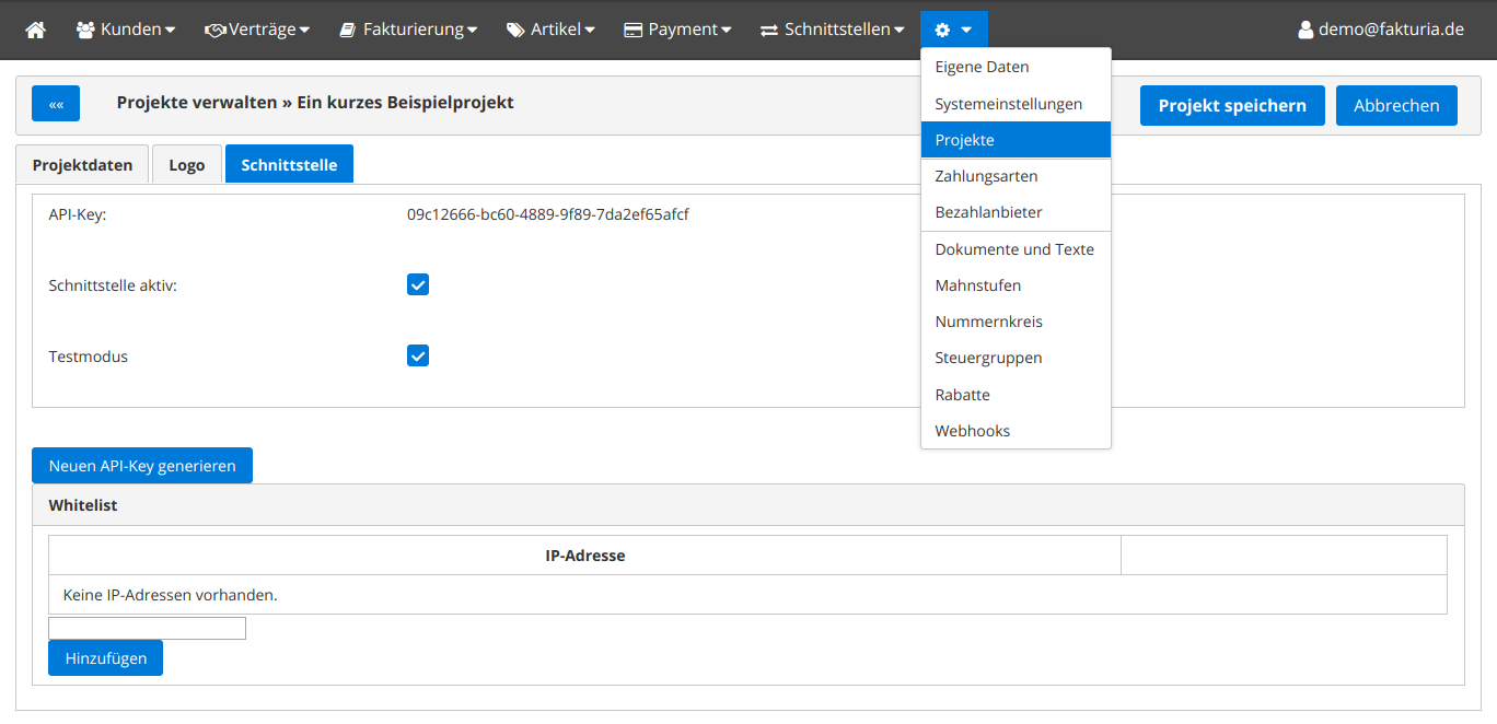 Im Tab Schnittstelle können Sie die REST-API für das Projekt aktivieren. Sie haben so die Möglichkeit, pro Projekt verschiedene Zugangsdaten für die API zu erstellen.