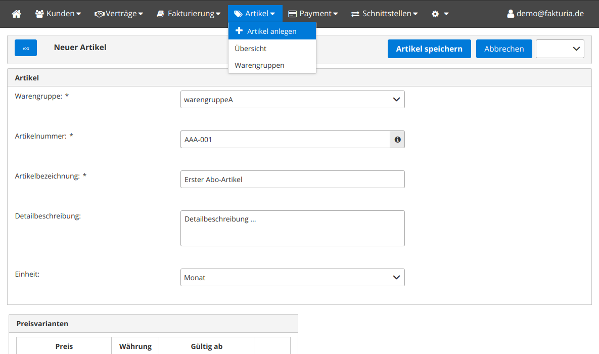 - die Einheit des Artikels: für Abo-Produkte wählen Sie hier immer eine Zeiteinheit aus (Tag, Woche, Monat, Jahr)