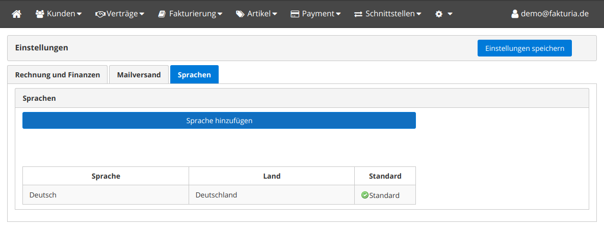 Im Bereich ⚙ → Systemeinstellungen haben Sie im Tab Sprachen die Möglichkeit, neben der voreingestellten Sprache weitere gewünschte Sprachen einzurichten. Wenn Sie also beispielsweise Kunden im Ausland mit englischen Texttemplates ansprechen möchten, richten Sie hier die Sprache "Englisch" ein.