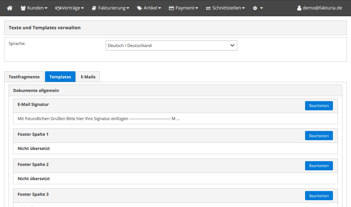 Im Tab Templates können Sie die E-Mail-Signatur sowie die Footer-Spalten auf den Dokumenten (z. B. Rechnung) anlegen: