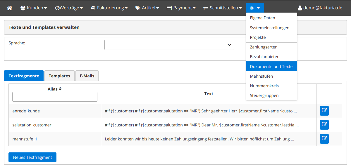 Damit das System individualisierte Texte auf Rechnungen oder in der E-Mail Signatur versenden kann, müssen diese von Ihnen noch angepasst werden. Wechseln Sie hierzu in den Bereich ⚙ → Dokumente und Texte.