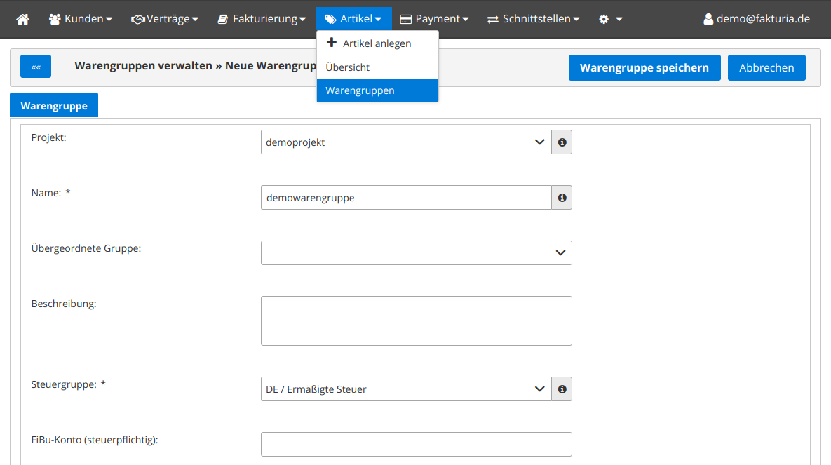 Eine Warengruppe können Sie unter Artikel → Warengruppen anlegen.