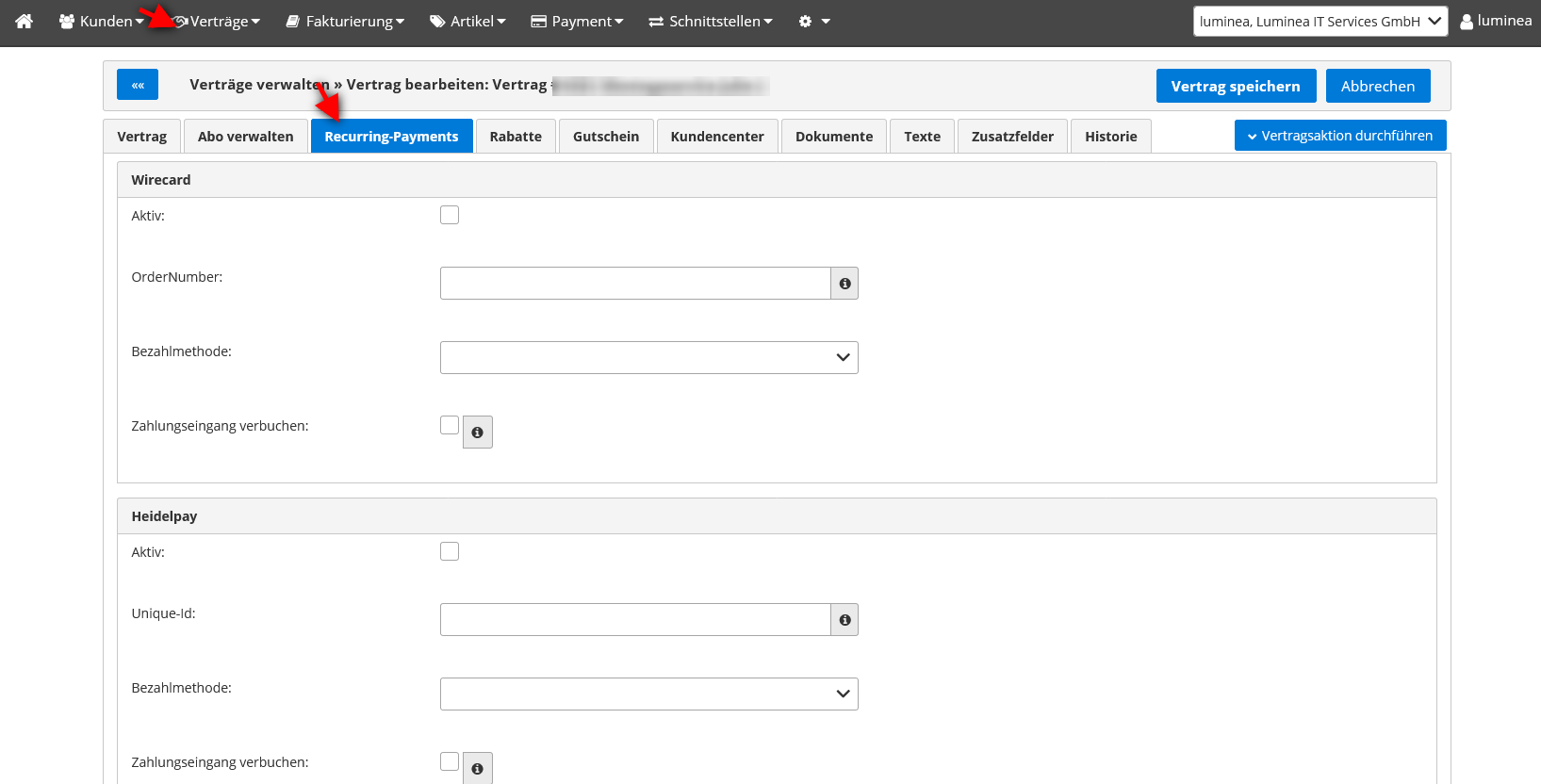 Referenz zum PSP am Vertrag im Tab Recurring-Payments eintragen: